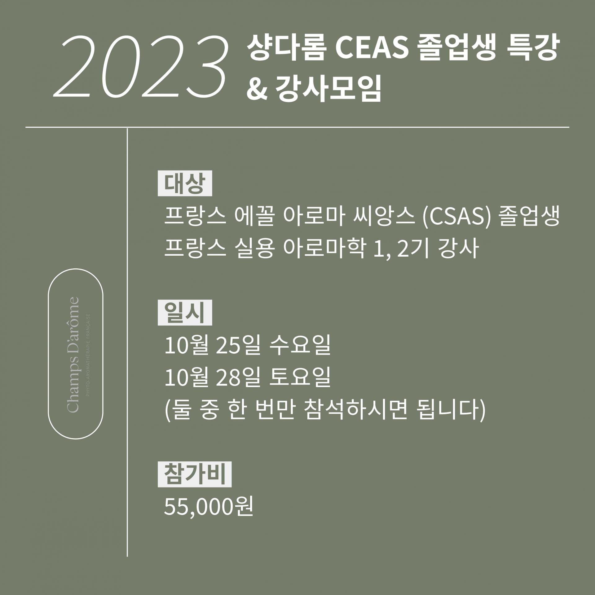 CEAS 자격증 수료식도 가질 예정이며, 2024년 1월에 있을 닥터 미쉘포꽁 선생님의 세미나 & 마스터클라스도 소개드릴 예정이니 관심 있으신 모든 CEAS 졸업생분들