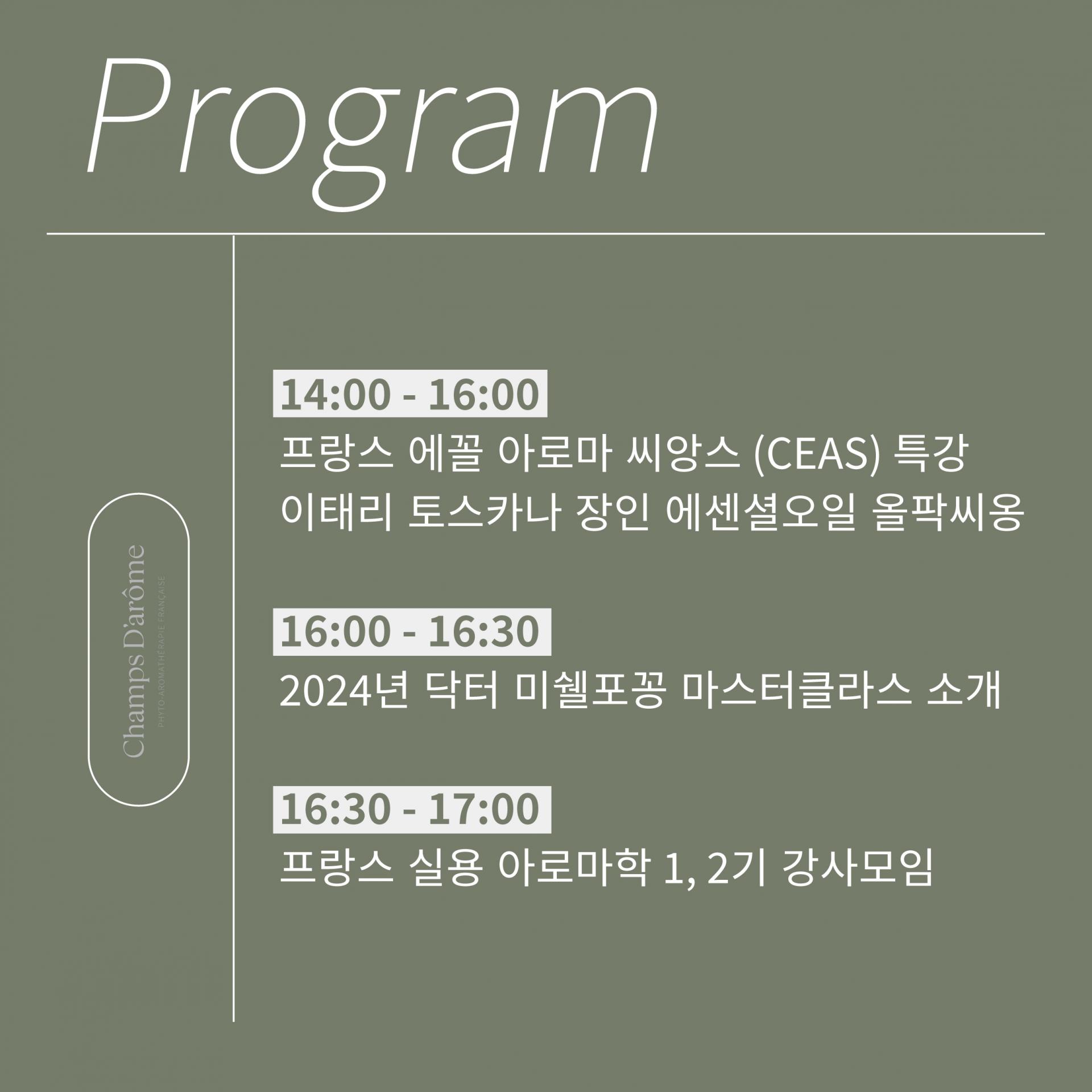 16:00부터 시작하는 2024년 닥터 미쉘포꽁 마스터클라스 소개와 프랑스 실용 아로마학 1, 2 기 강사 모임만 참여 원하시는 분들은 무료이며,