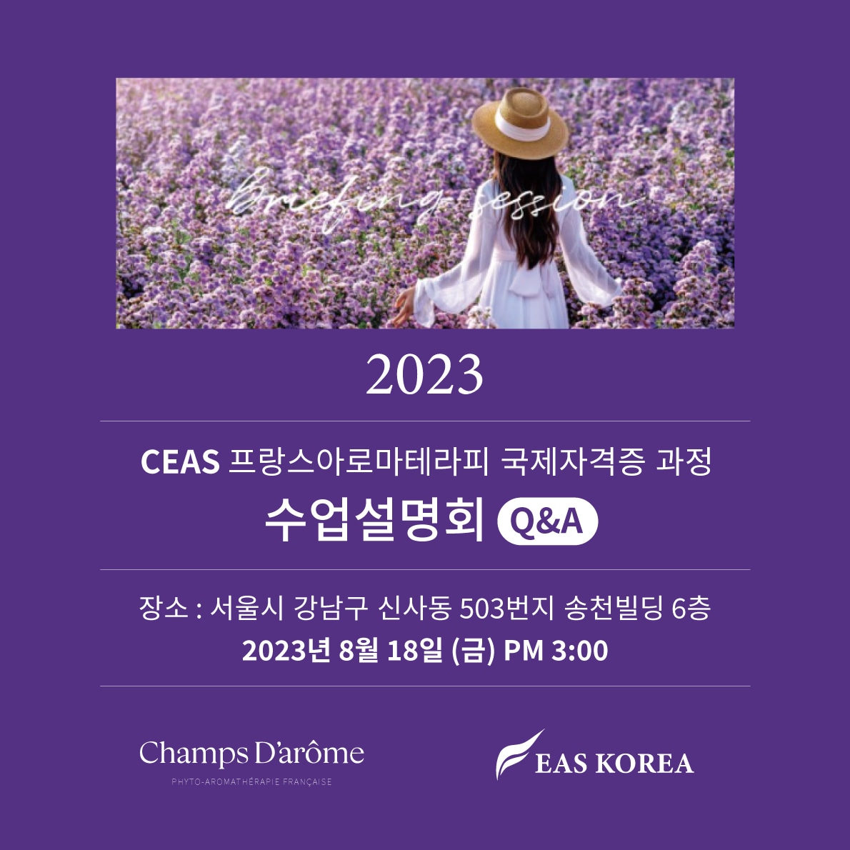CEAS 프랑스 아로마테라피 국제자격증 과정 수업 설명회 Q&A에 대한 수업 설명회를 준비했습니다.
