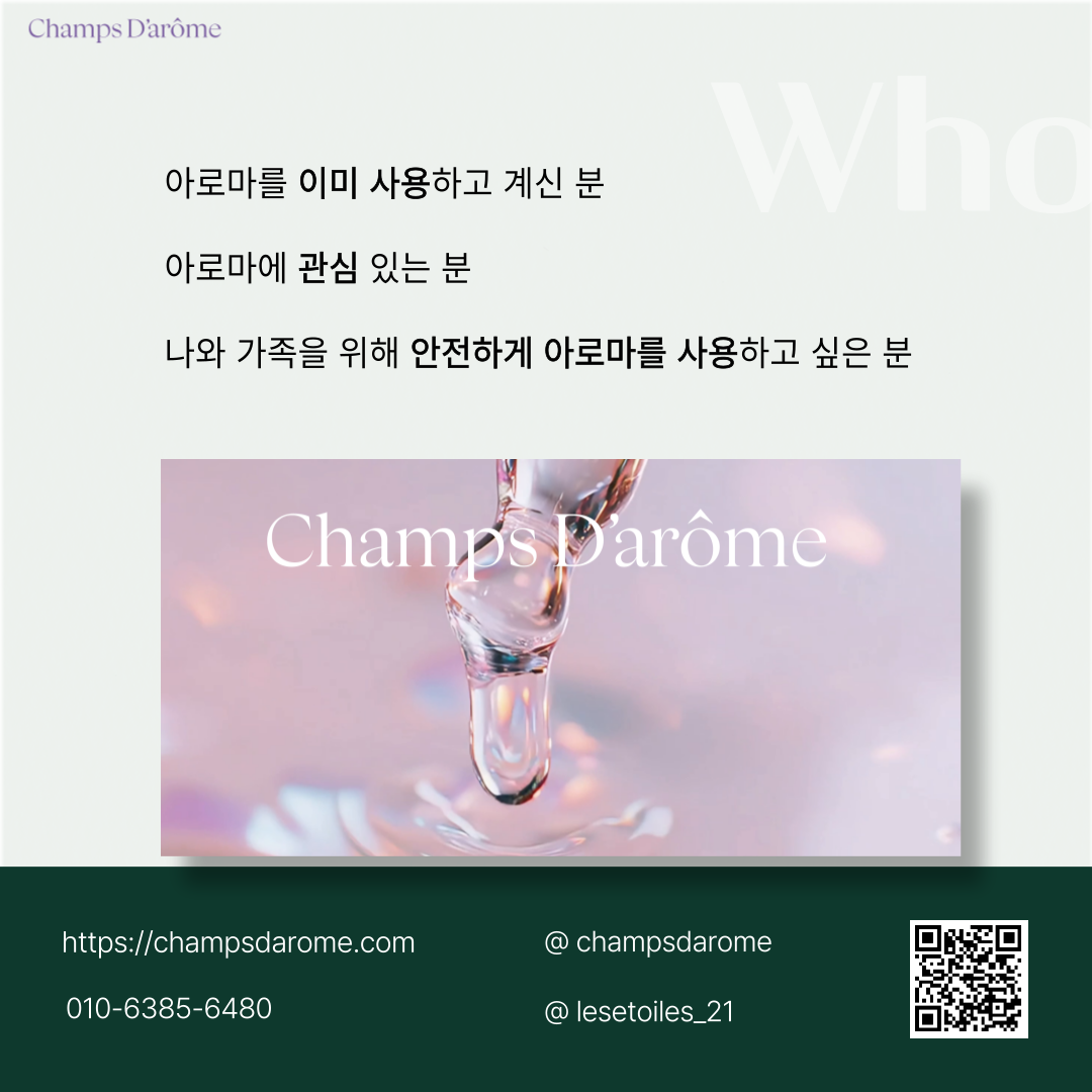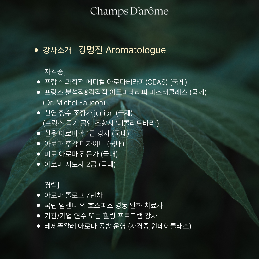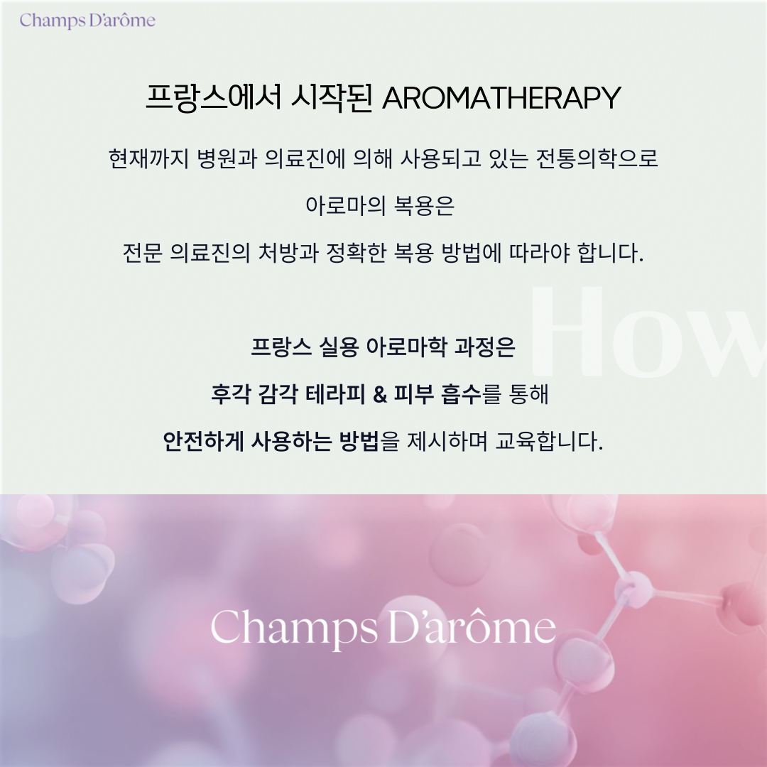 최근 들어 국내에서도 다양한 프랑스 아로마테라피 교육과 제품을 접할 수 있게 되어, 많은 분들이 아로마를 생활화 하게 된 것 같아 기쁜 마음입니다. 더불어 아로마테라피 교육에 진심인 한 사람으로써 책임감도 더욱 느낍니다.