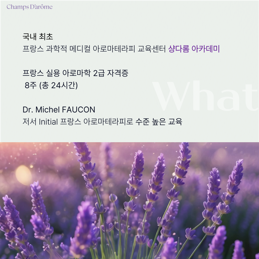 샹다롬 아카데미는 국내 최초 프랑스 과학적 메디컬 아로마테라피 교육기관이며, 현재도 한국 분교의 역할을 다하며, 정통 프랑스 아로마학을 깊고 넓게 배울 수 있도록 다양한 수업이 준비되어 있습니다.