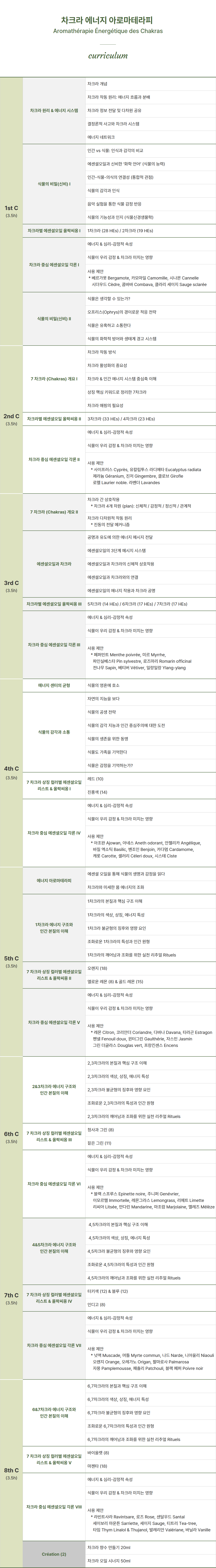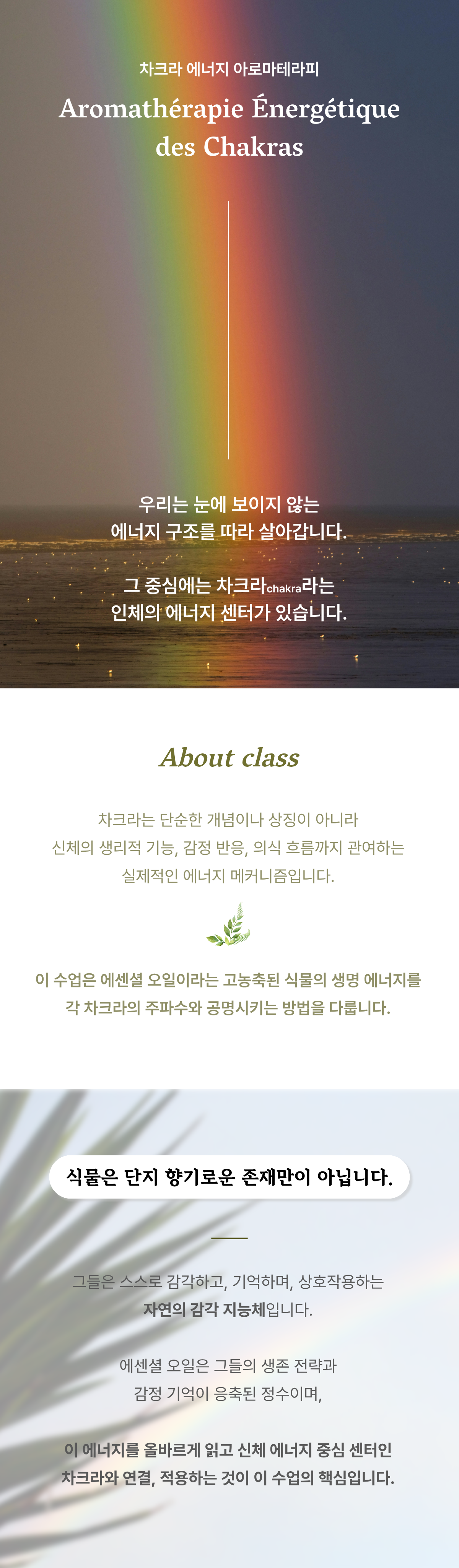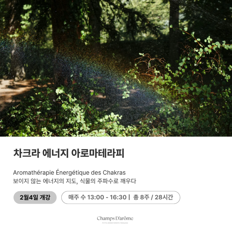 차크라 에너지 아로마테라피 수업은 식물의 감각 에너지와 인간의 에너지 센터(차크라)를 연결하는 통합 아로마테라피 수업입니다. 향, 감정, 진동, 색채를 매개로 신체와 감정, 에너지를 다차원적으로 이해하고 조화롭게 다루는 방법을 배웁니다. 아로마 입문자부터 웰니스 전문가까지 모두에게 열려 있습니다.