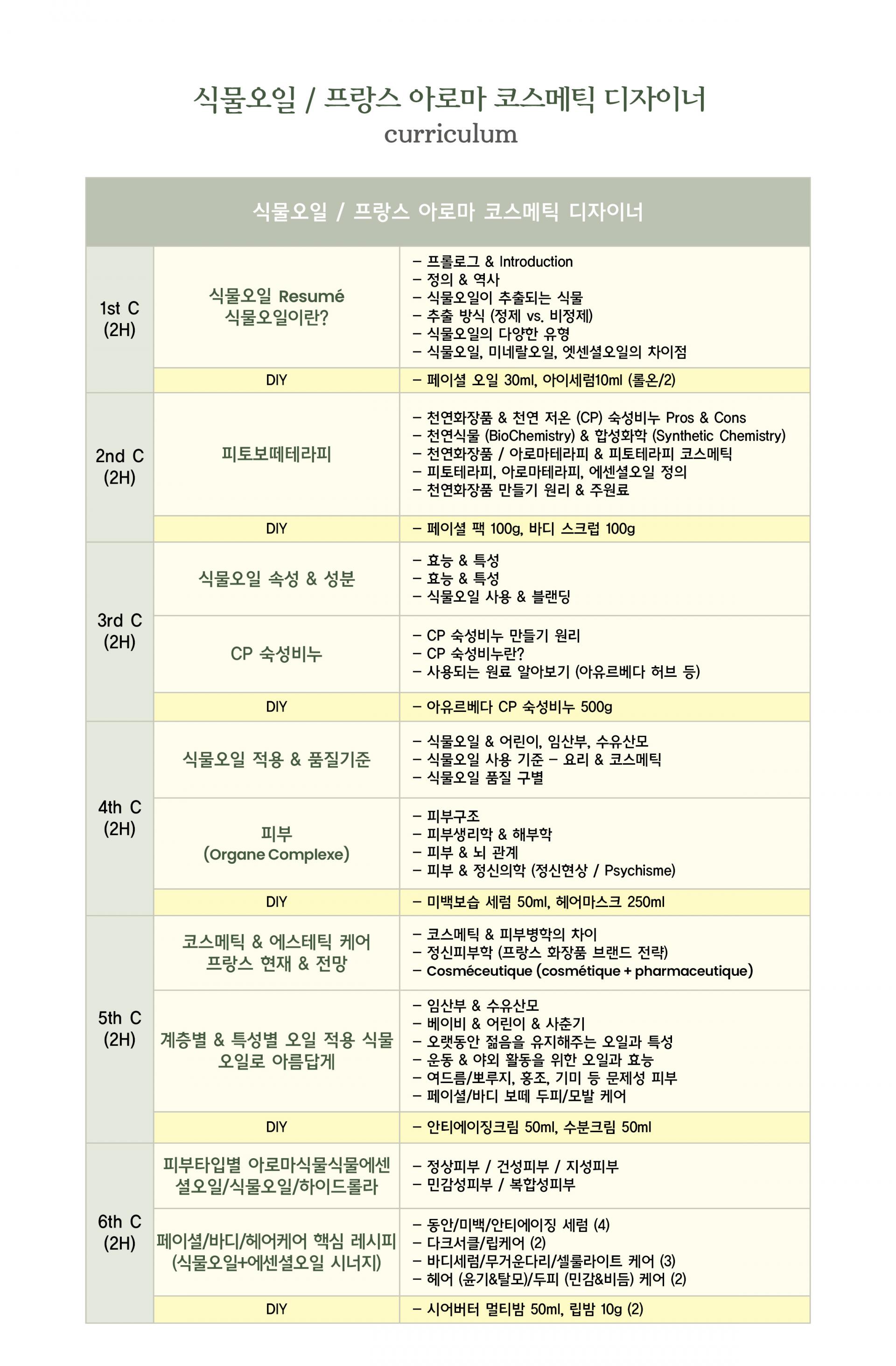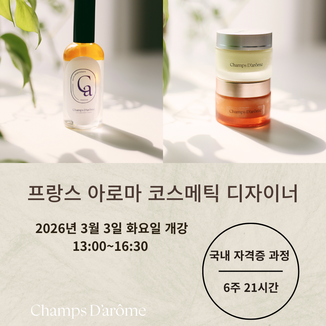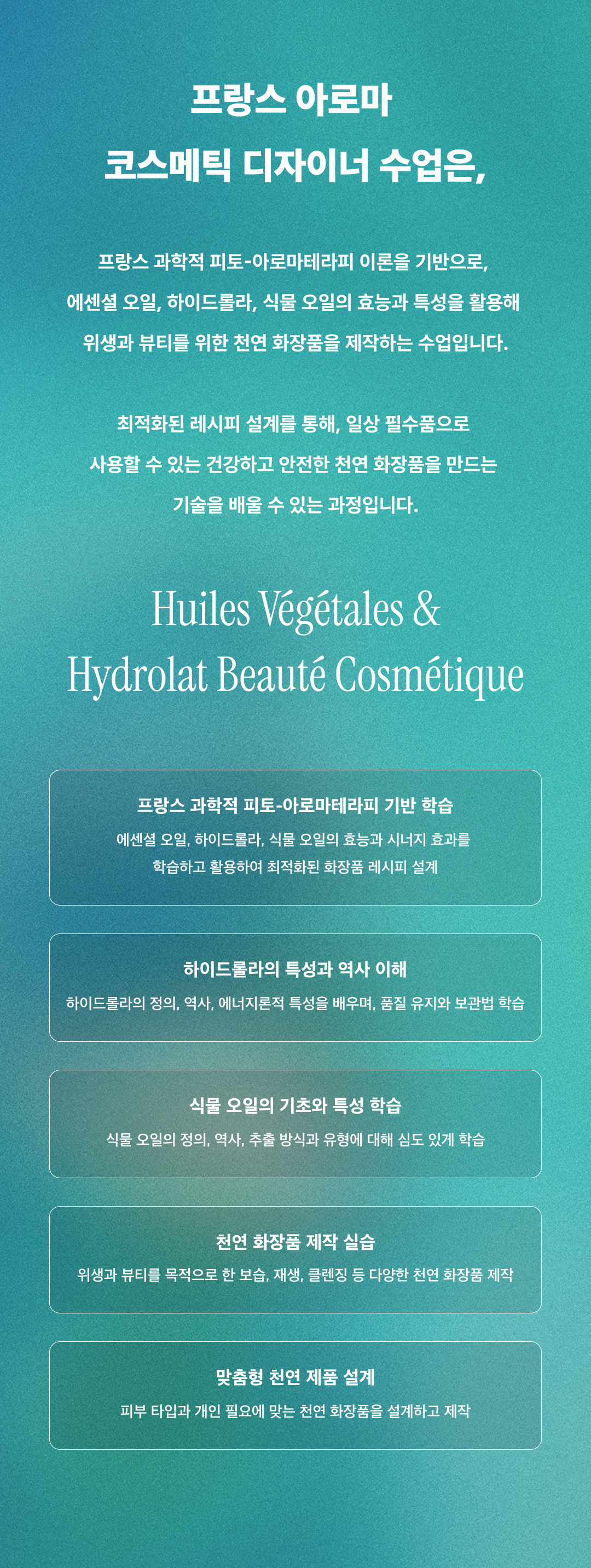 프랑스 아로마 코스메틱 디자이너 과정은 과학적 피토-아로마테라피 이론을 기반으로, 에센셜 오일, 하이드롤라, 식물 오일의 효능과 특성을 활용해 위생과 뷰티를 위한 천연 화장품을 제작하는 수업입니다. 최적화된 레시피 설계를 통해, 일상 필수품으로 사용할 수 있는 건강하고 안전한 천연 화장품을 만드는 기술을 배울 수 있는 과정입니다.