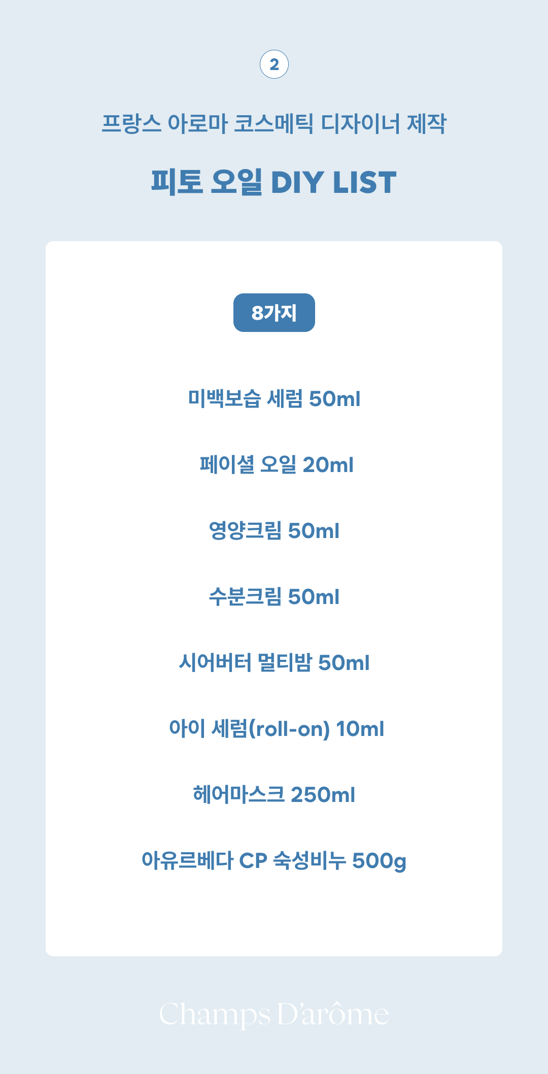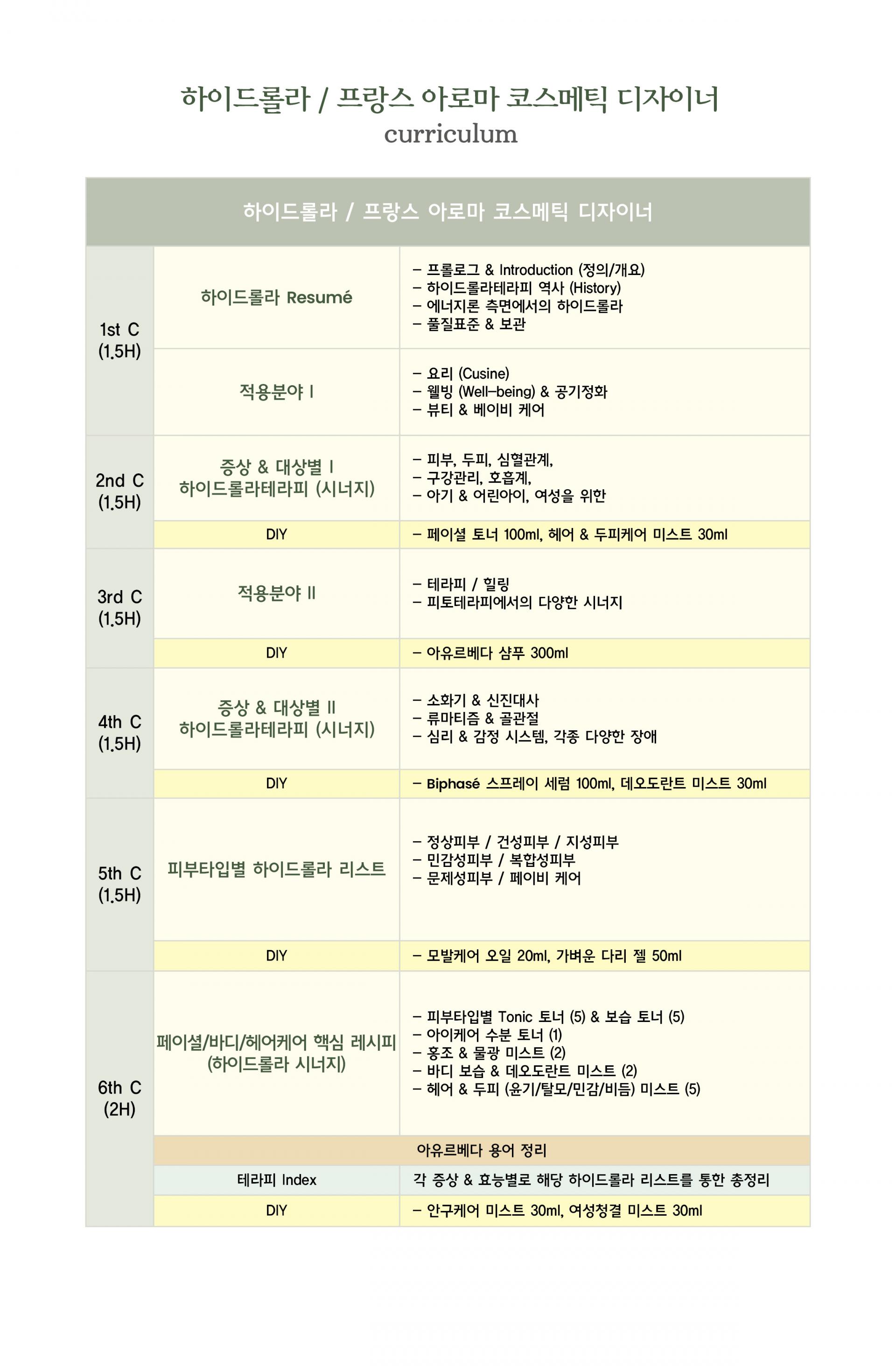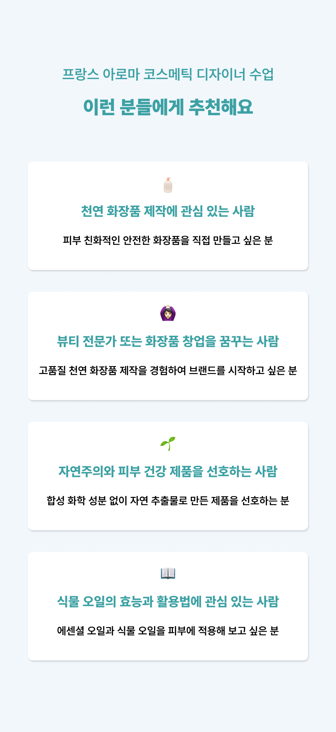 프랑스 아로마 코스메틱 디자이너 과정은 과학적 피토-아로마테라피 이론을 기반으로, 에센셜 오일, 하이드롤라, 식물 오일의 효능과 특성을 활용해 위생과 뷰티를 위한 천연 화장품을 제작하는 수업입니다. 최적화된 레시피 설계를 통해, 일상 필수품으로 사용할 수 있는 건강하고 안전한 천연 화장품을 만드는 기술을 배울 수 있는 과정입니다.
